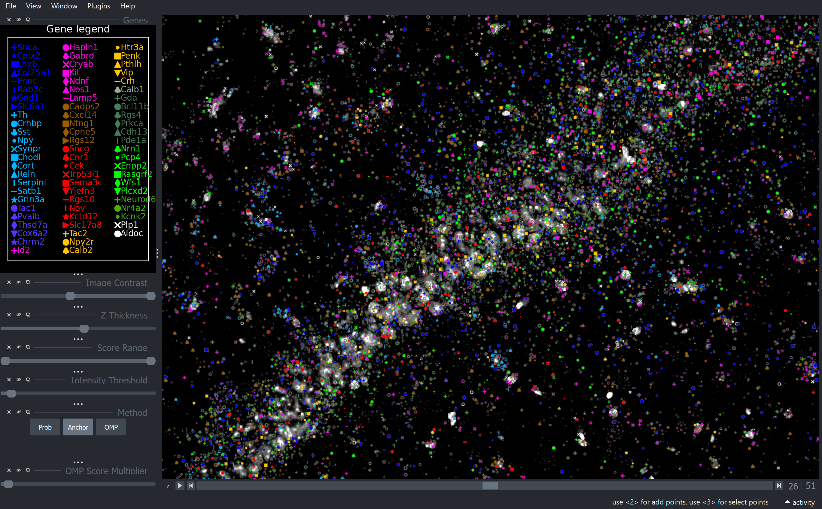 The "Image Contrast" slider below the gene legend will affect the colour scale of the DAPI image. The "z Thickness" allows for multiple z planes of genes to be displayed at once. Genes further away in z are smaller. The "Score Range" allows the user to change the minimum and maximum scores to be displayed. The "Intensity Threshold" affects the minimum allowed spot intensity to display (only affects Anchor and OMP). The "Method" is the chosen method of gene calling. "Prob" is the Von-Mises probability method, "Anchor" is the anchor method (see call spots), and "OMP" is the Orthogonal Matching Pursuit method (see OMP). The "OMP Score Multiplier" will affect how much weight positive coefficient has over negative coefficient parts of a spot. We recommend a value \(\ge1\), but there is no known optimal value.